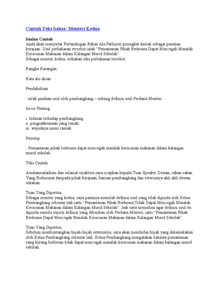 Contoh teks perbahasan ala parlimen menteri kedua yang boleh digunakan sebagai panduan.full description.