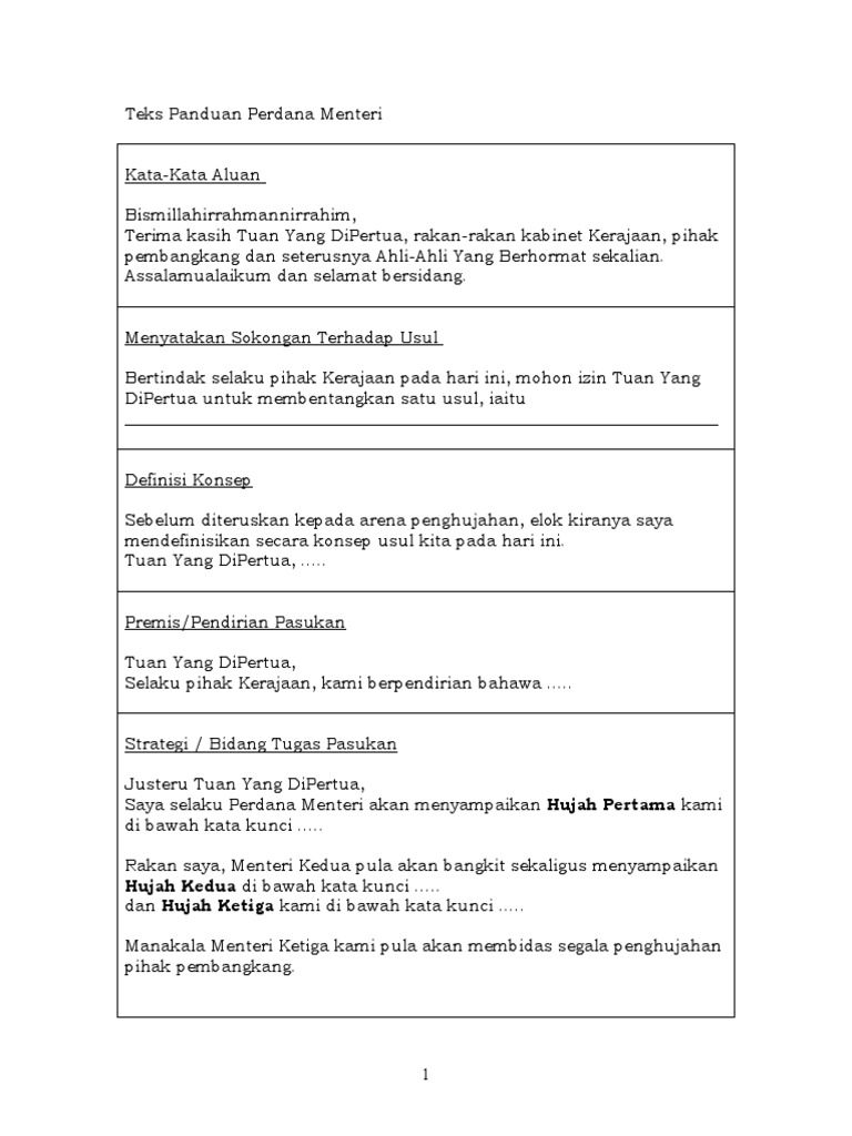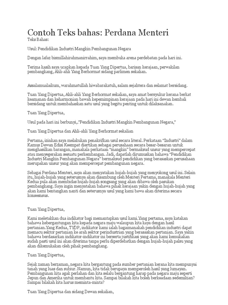 Teks Bahas Menteri Pertama from img.pdfslide.tips Sebentar tadi perdana menteri telah membentangkan satu hujah iaitu kertas konsep bahas bahasa melayu ala parlimen sekolah menengah kementerian pelajaran malaysia. Pemerintahan presiden barack obama 4. 168,895 likes · 1,621 talking about this. Teks debat bahasa arab pdf. Teks dan video ucapan tun mahathir mohamad perdana menteri interim. Yang dipertuan agong bertitah supaya saya dilantik sebagai perdana menteri sementara. Bahasa inggris good morning all. Tujuan teks prosedur adalah memberi informasi terkait masalah.