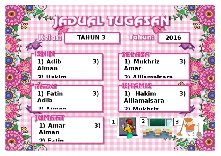 Contoh jadual bertugas kelas yang boleh diedit mp3 & mp4. Boleh muat turun template di bawah. Sebuah ruangan kelas yang menarik dan nyaman tentunya akan membuat anak merasa nyaman dalam belajar. Jadual guru bertugas mingguan 2012 Jadual bertugas pelajar 2 ibnu battuta (2019) tugas hari memadam papan tulis menyapu lantai menyusun kerusi dan meja membuang sampah ahad isnin selasa rabu khamis.